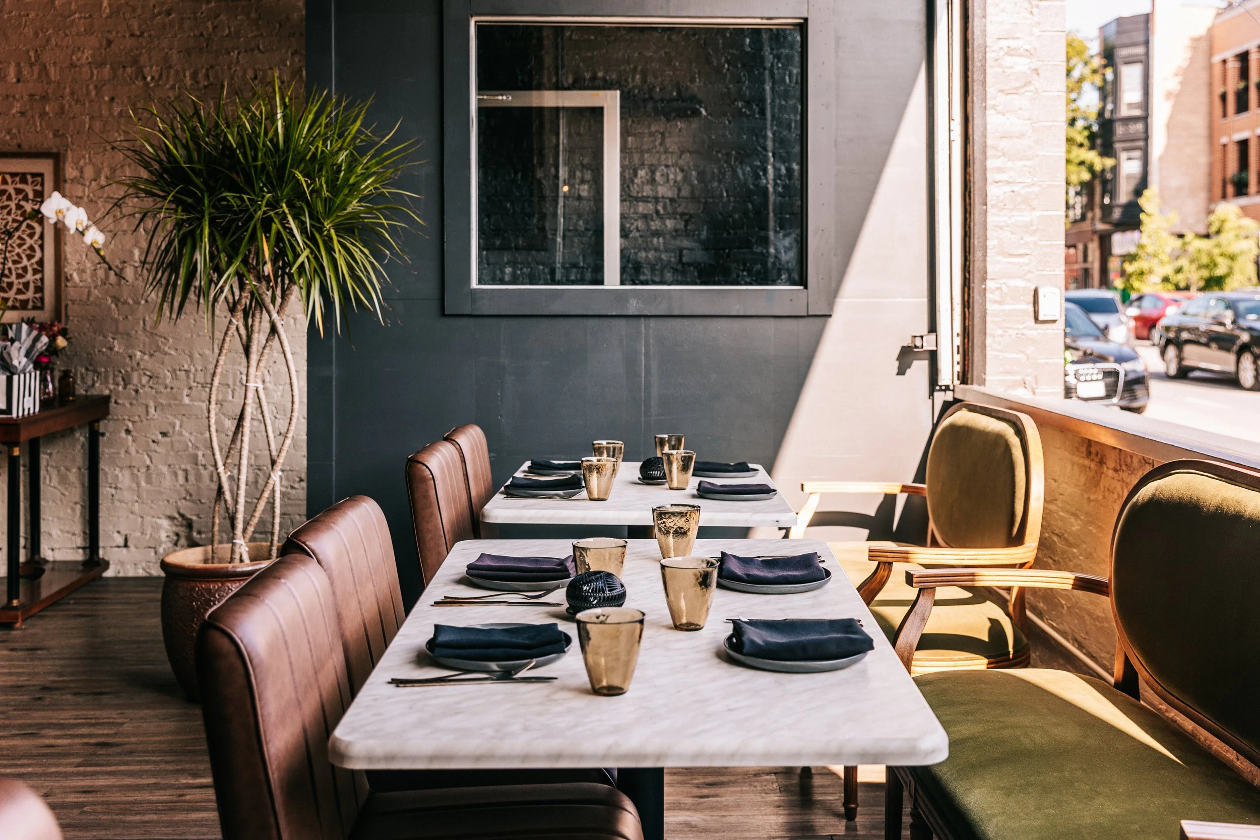 Just off the entrance, we have three long tables in a cozy area, perfect for an intimate gathering.